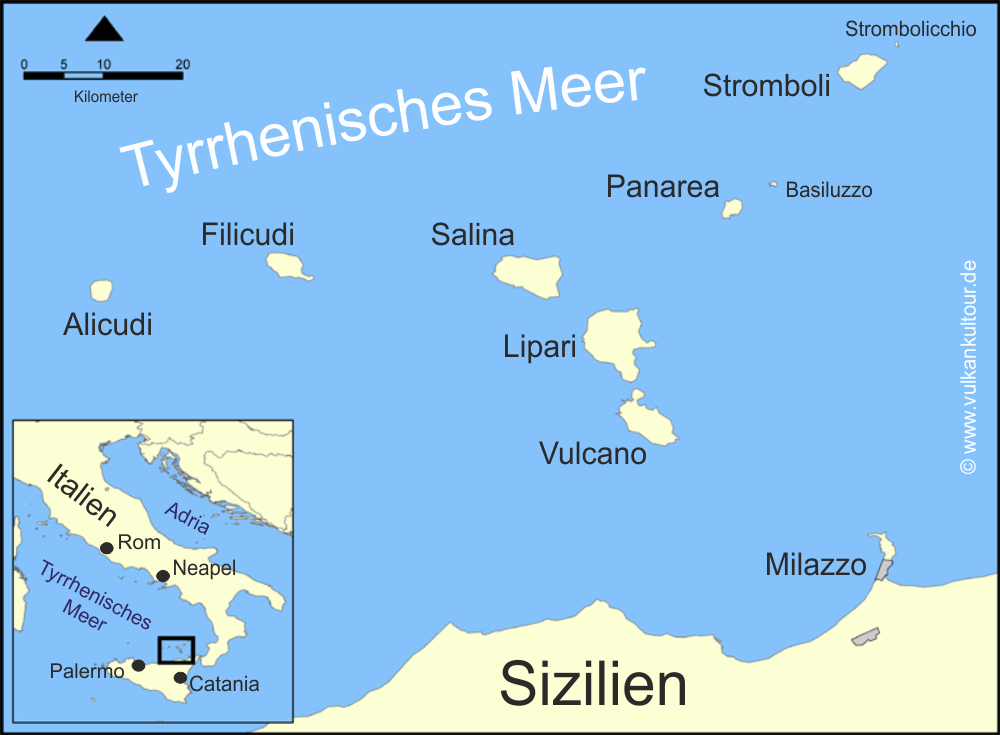 | – Lipari (Hauptstadt) – Stromboli (Vulkaninsel) – Vulcano – Salina – Panarea – Filicudi – Alicudi |